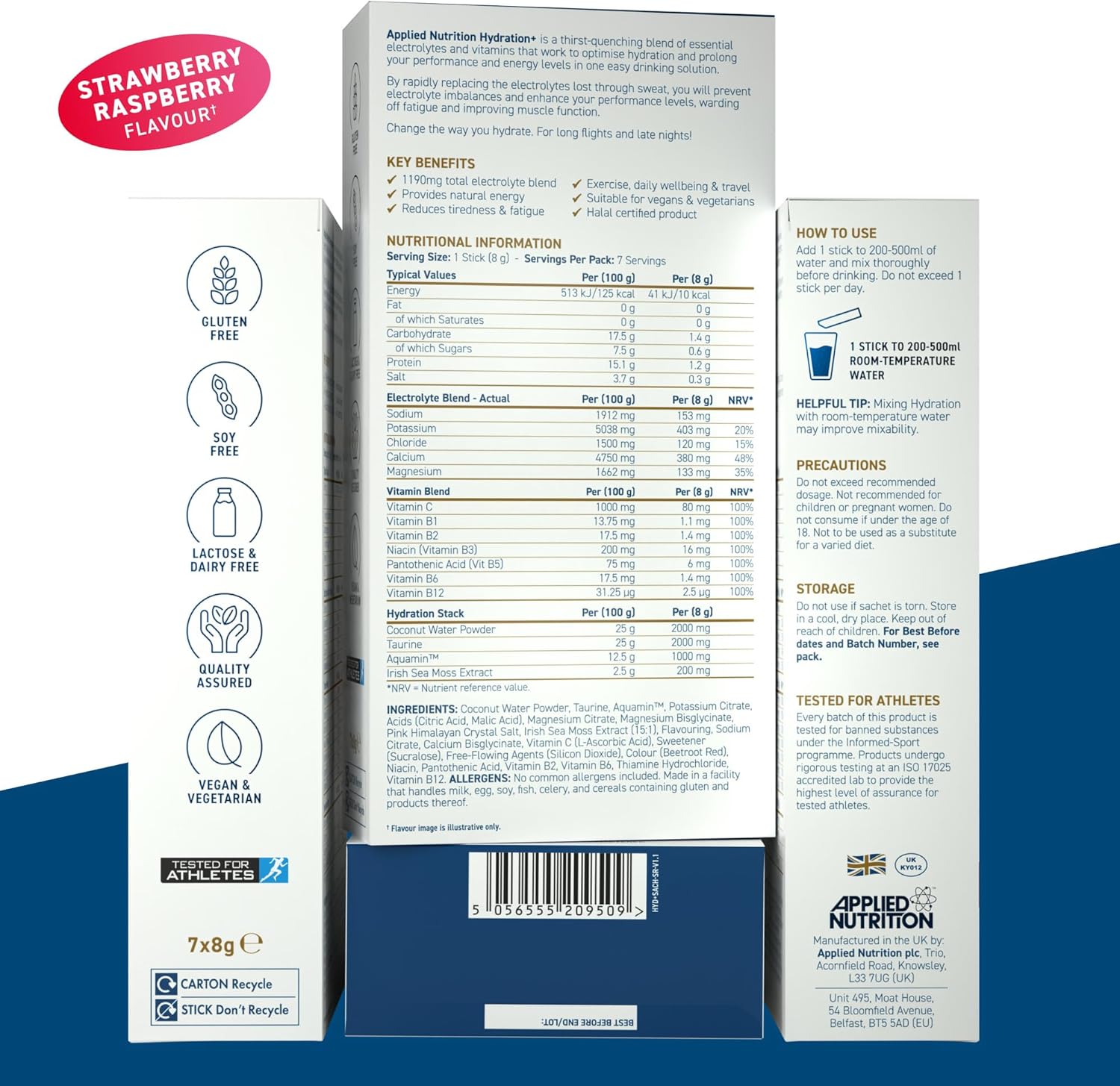 Гідратаційний стек включає порошок кокосової води, таурин, Aquamin™ та екстракт ірландського морського моху. Кокосова вода є природним джерелом електролітів, таурин підтримує витривалість і клітинну гідратацію, Aquamin™ є джерелом мінералів морського походження, а морський мох додатково збагачує формулу мікроелементами.