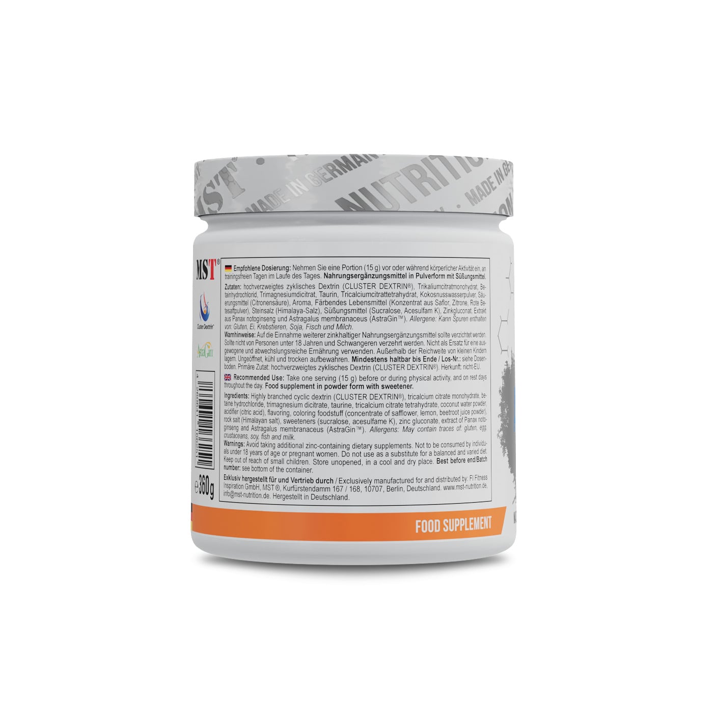 До складу входять калій, магній, кальцій та натрій, які відіграють важливу роль у підтримці електролітного балансу, запобігають судомам і сприяють нормальному функціонуванню м’язів. Додатково формула збагачена швидкими вуглеводами для поповнення енергії, таурином і бетаїном для підтримки витривалості, а також комплексом рослинних екстрактів для покращення засвоєння поживних речовин.