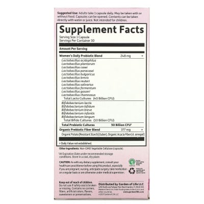 Garden of Life Dr. Formulated Probiotics Once Daily Women's містить органічну картоплю (стійкий крохмаль) та органічне волокно акації, які виступають натуральними пребіотиками. Вони живлять корисні бактерії, сприяють їх росту та активності в кишковому середовищі, забезпечуючи синергетичний ефект для вашого здоров’я.