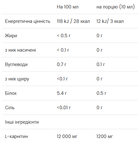 Інгредієнти: Вода, L-Карнітин, регулятор кислoтності (лимонна кислoта), підсолоджувач (сукралоза), загусник (ксантанова камедь), консервант (сорбат калію), ароматизатор