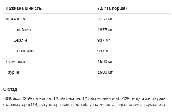 - Оптимальне співвідношення BCAA 2:1:1 для ефективного росту м’язів.