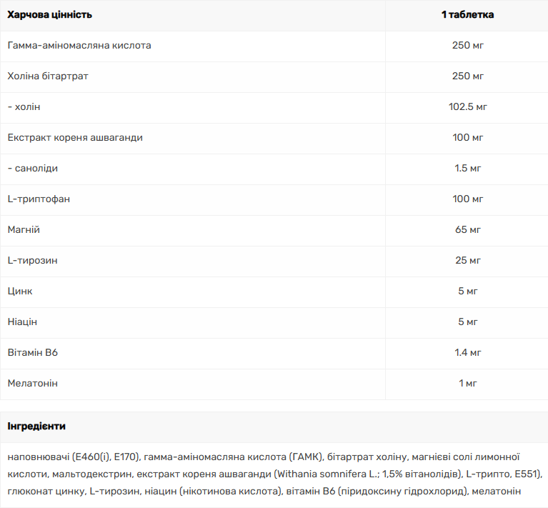 До складу входять такі ключові інгредієнти, як мелатонін, що регулює біоритми і допомагає заснути, магній для розслаблення м’язів і нервової системи, а також екстракти рослин із заспокійливими властивостями. Комплекс сприяє виробленню гормонів росту під час сну, що є важливим для відновлення м’язів і збереження сили. Крім цього, продукт підтримує нормальний психоемоційний стан, знижує відчуття стресу та покращує якість сну, роблячи його більш глибоким і відновлювальним.