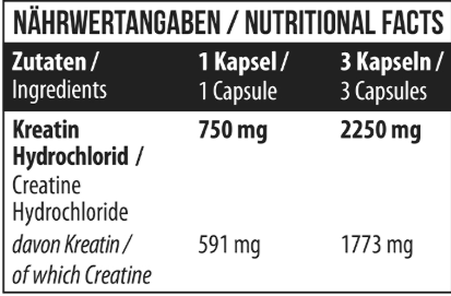 Креатин відіграє ключову роль у відновленні молекул АТФ — основного джерела енергії для м’язів під час коротких та інтенсивних навантажень. Регулярне вживання креатину гідрохлориду сприяє зростанню силових показників, підвищенню вибухової потужності та покращенню загальної тренувальної витривалості.