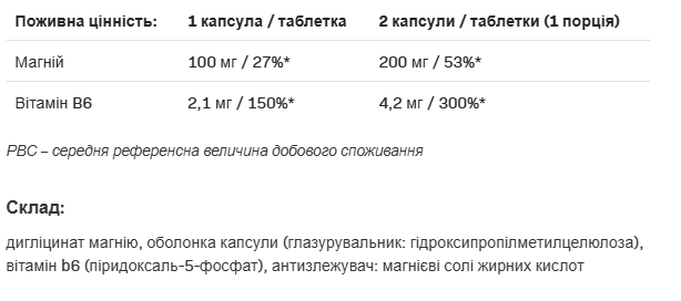 Продукт містить високу дозу елементного магнію в хелатній формі — одній з найбільш біодоступних і безпечних для щоденного використання. У поєднанні з вітаміном B6, який посилює транспорт магнію до клітин, добавка діє швидко та ефективно, зменшуючи симптоми втоми, дратівливості, безсоння та нервової напруги.