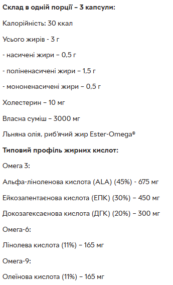 Приймайте по 1–2 капсули 1–2 рази на день під час їжі, запиваючи водою. Регулярне вживання забезпечить стабільне надходження необхідних жирних кислoт для підтримки здоров’я серця, мозку та шкіри.