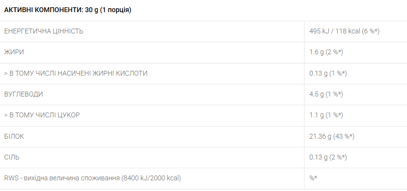 Змішати 1 порцію (приблизно 30 г) з 200–250 мл води або молока та вживати 1–2 рази на день, залежно від індивідуальної потреби в білку. Найкращий час прийому — після тренування та між основними прийомами їжі.
