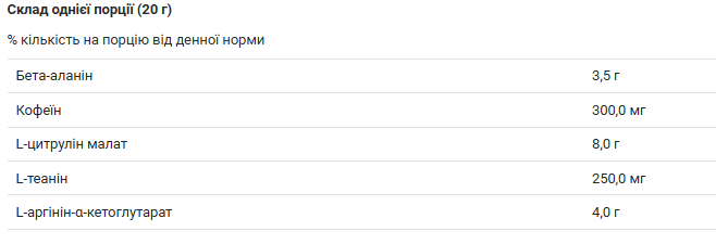 Зазвичай рекомендується приймати порцію за 20–30 хвилин до початку тренування. Можна коригувати кількість залежно від індивідуальної чутливості до стимуляторів. Вживати лише в дні тренувань.