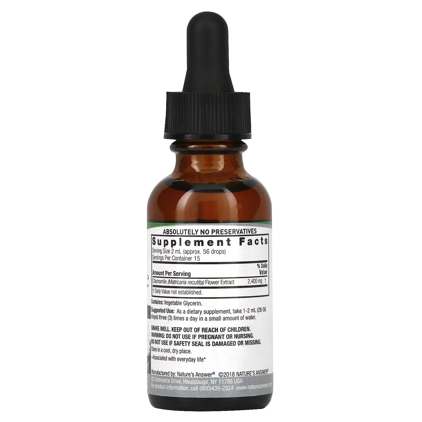 Nature's Answer Chamomile Extract – дієтична добавка, що містить екстракт квіток ромашки. Хімічний склад ромашки багатий на кислoти, дубильні речовини, ефірні олії, камідь та віск. Рослина містить макро і мікроелементи, що мають протизапальні та протимікробні властивості. Завдяки наявності хамазулену, препарати ромашки знімають запалення, протистоять алергічним проявам. Хамазулен має антисептичні властивості та знеболювальну дію.
