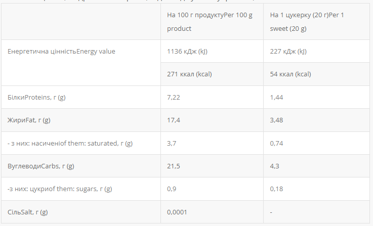 Склад: ізомальтосахариди, какао терте, какао-масло, подрібнені горіхи (мигдаль, фундук), глазур кондитерська (жир кокосовий, ізомальтосахариди, какао-порошок, соєвий лецитин, підсолоджувач: сукралоза), карамель (ізомальтосахариди, вода питна підготовлена, підсолоджувач: мальтитол), крихта вафель (борошно в/г, вода питна підготовлена, сіль), соєвий лецитин, подрібнений арахіс, підсолоджувач: сукралоза, ванілін. Без ГМО.
