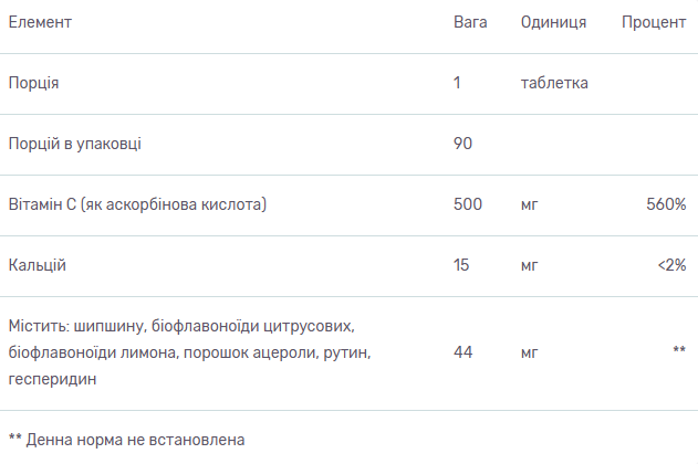 - Поєднання з біофлавоноїдами та шипшиною підсилює дію вітаміну C.