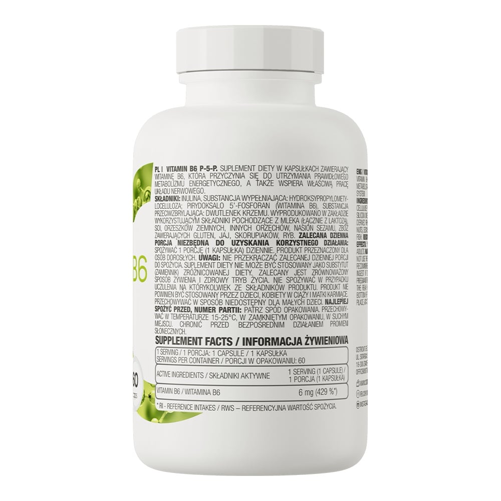 OstroVit Vitamin B6 P-5-P містить піридоксаль-5-фосфат — біологічно активну форму вітаміну B6, яка не потребує додаткового перетворення в організмі та одразу бере участь у метаболічних процесах. Завдяки цьому продукт відзначається високою біодоступністю та ефективністю.