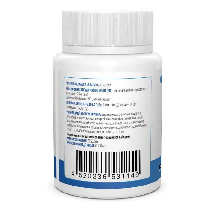 - Підтримка нормального рівня заліза: забезпечує організм легко засвоюваним гліцинатом заліза, який допомагає підтримувати оптимальний рівень заліза, що є важливим для запобігання його дефіциту та наслідків, таких як втома, слабкість й знижена працездатність;