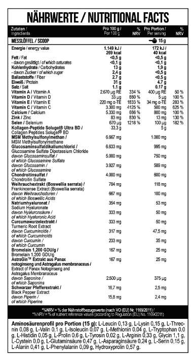 - Допомагає зменшити запалення при пошкодженнях суглобів та сухожилля внаслідок додавання до складу МСМ (природне джерело біологічно доступної для організму сірки);